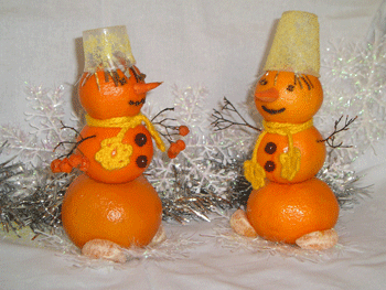 Шарфики можно позаимствовать у кукол, связать самим либо сделать из лент. По желанию прикрепите «ножки» из мандариновых долек. Веселый снеговик готов.