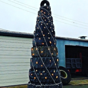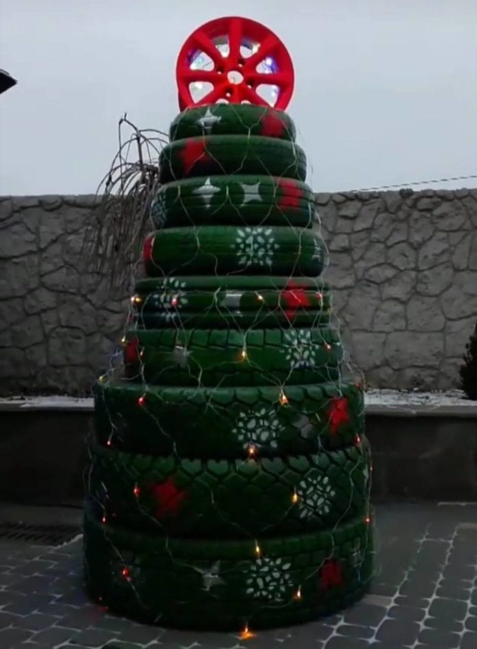 В Пологах Запорожской области соорудили необычную новогоднюю красавицу. Как и полагается, она зеленая и колючая, только собрана из колес, словно пирамидка.