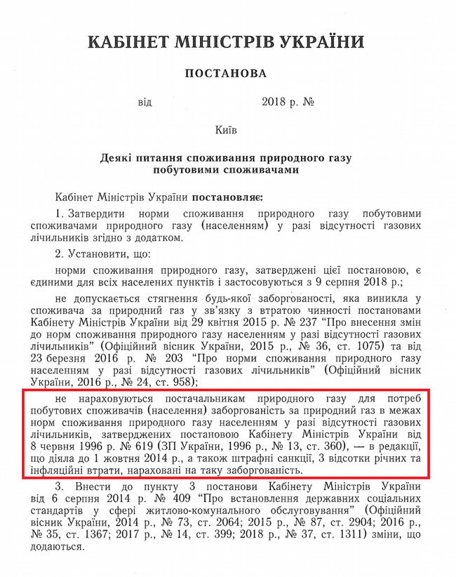 А і ось друга норма - найважливіша новела: "Не нараховується постачальникам природного газу для потреб побутових споживачів (населення) заборгованість за природний газ в межах норм споживання природного газу населенням у разі відсутності газових лічильників, затверджених постановою Кабінету Міністрів України від 8 червня 1996 р. № 619 в редакції, що діяла до 1 жовтня 2014 року, а також штрафні санкції, 3 відсотки річних та інфляційних втрат, нарахованих на таку заборгованість."