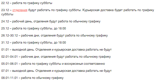 До 11 января и сами почтовые отделения, и курьерская служба будут работать по следующему графику: