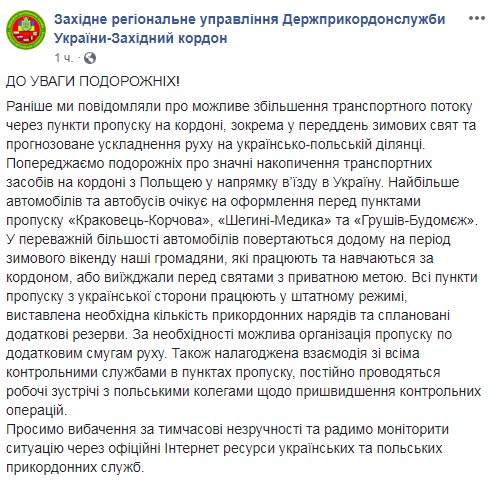 Очереди начали образовываться из-за массового возвращения украинцев в канун новогодних праздников. Самыми загруженными пунктами пропусков остаются Краковец-Корчева, Шегини-Медика и Грушев-Будомеж.