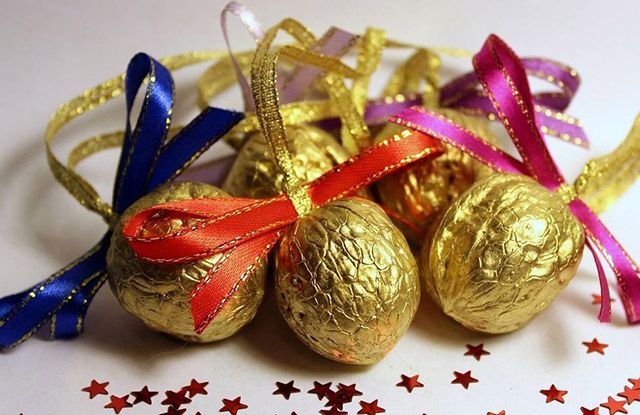 Новогоднюю красавицу можно украсить и грецкими орехами, обернутыми в фольгу. А чтобы это украшение стало еще и интересным, можно в каждый такой шарик завернуть написанное на бумаге желание.