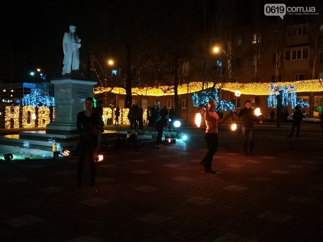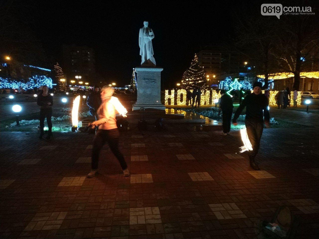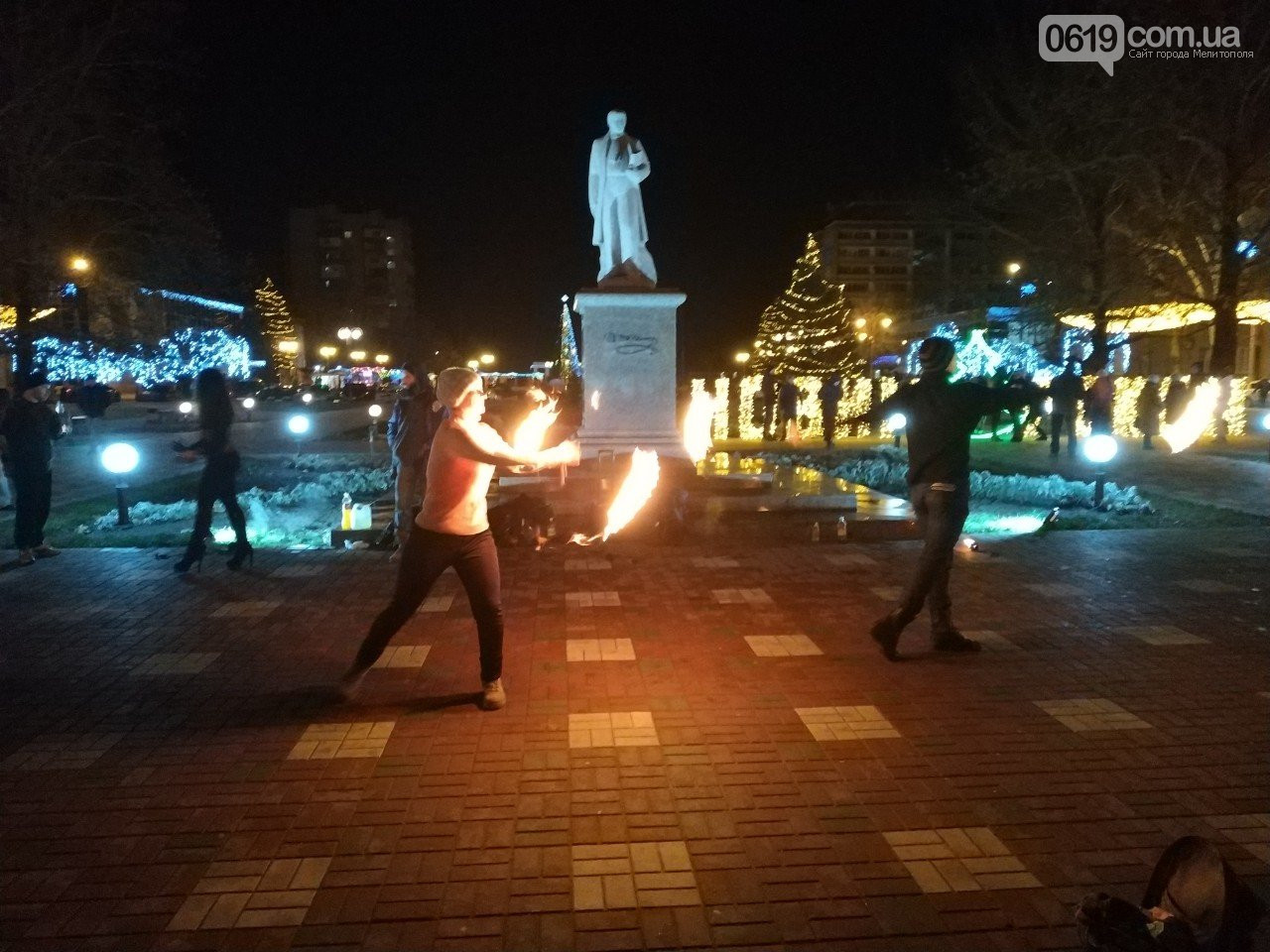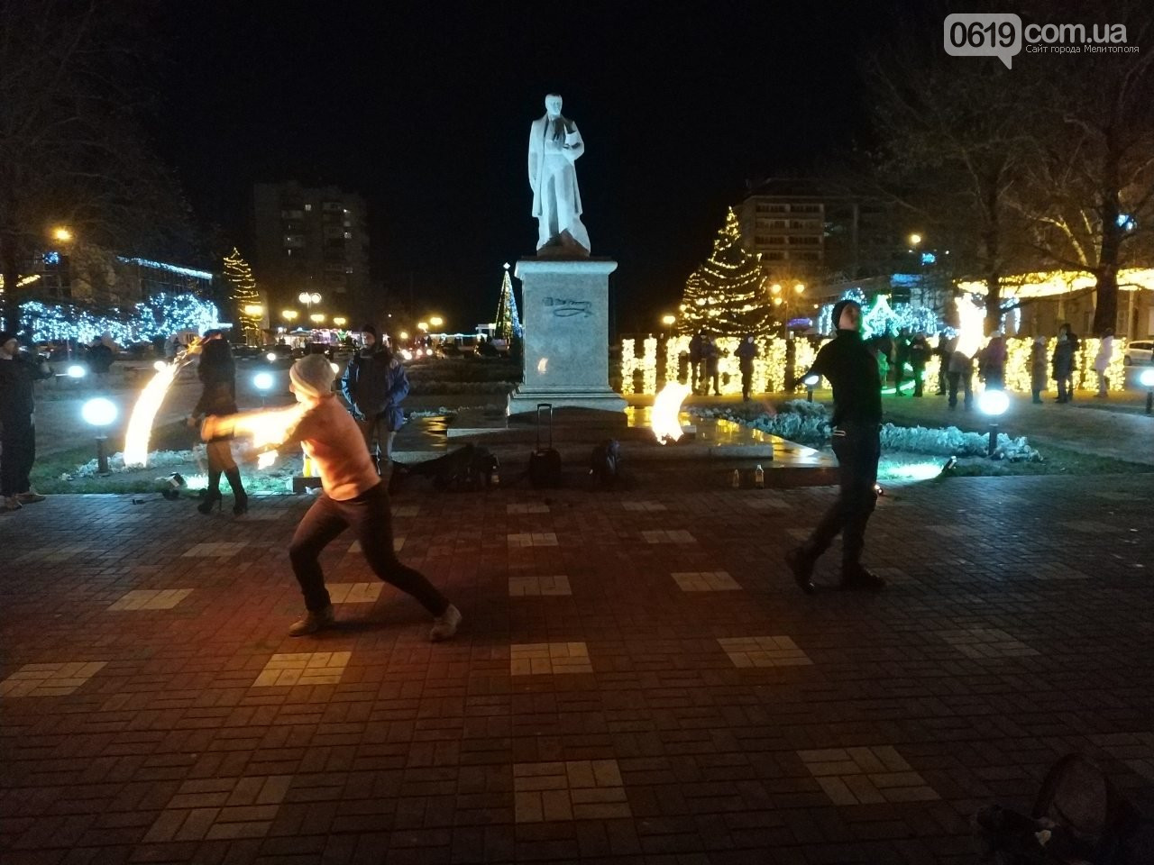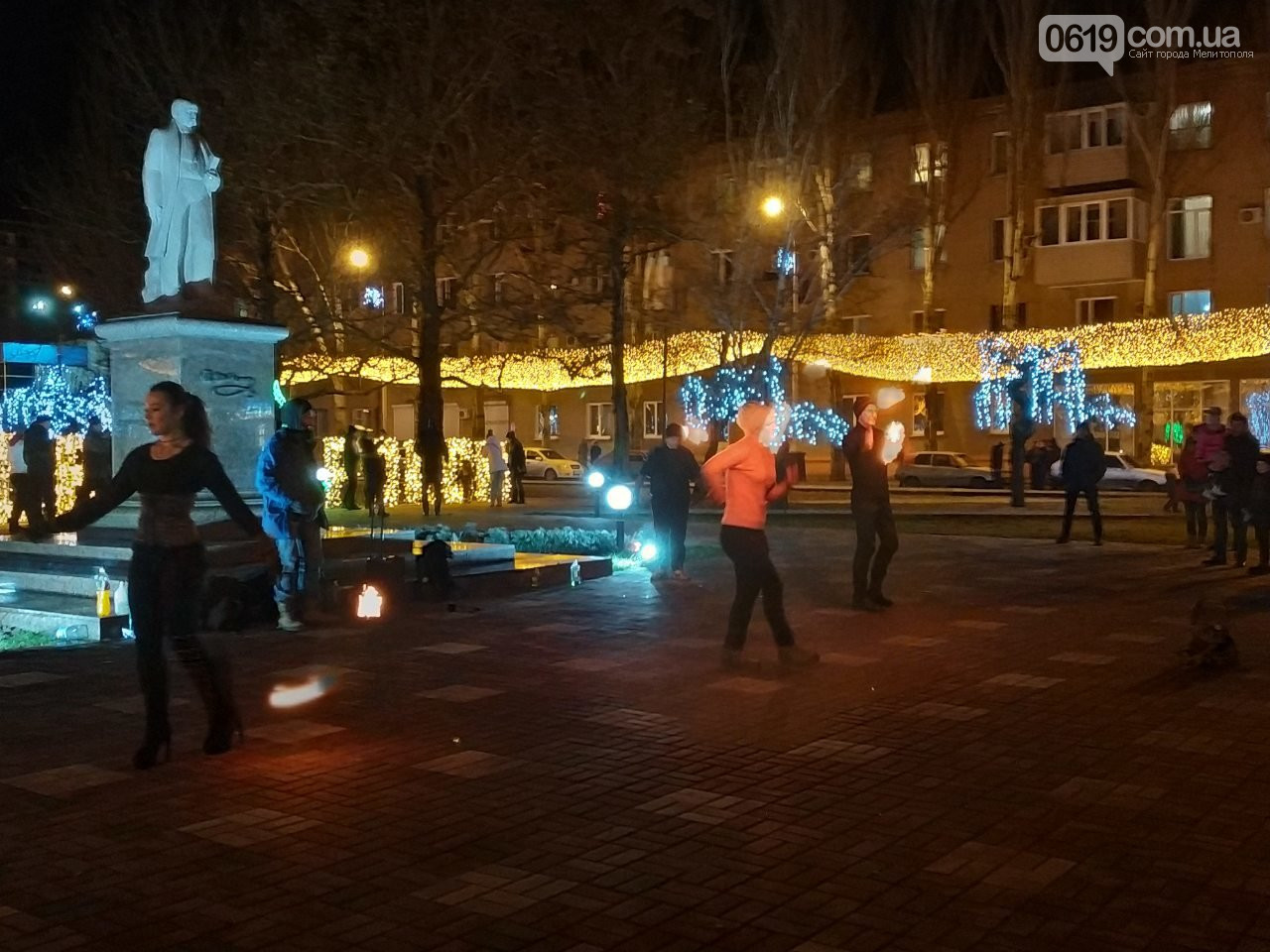 Молодые люди удивляли мелитопольцев исполнением различных трюков с огнем. Выступление сопровождалось музыкой. Артисты собрали возле себя несколько десятков зрителей.