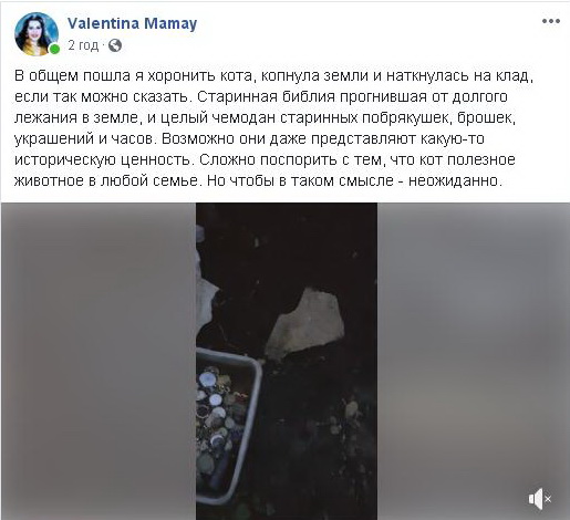 Известная в Бердянске зоозащитница Валентина Мамай нашла сокровище, копая ямку для кота, погибшего под колесами авто. Женщина выкопала какую-то коробку, в который насыпью лежали украшения, часы, ложки, а также стакан из темного металла, возможно серебра. Кроме того, рядом зоозащитница нашла старинную Библию.