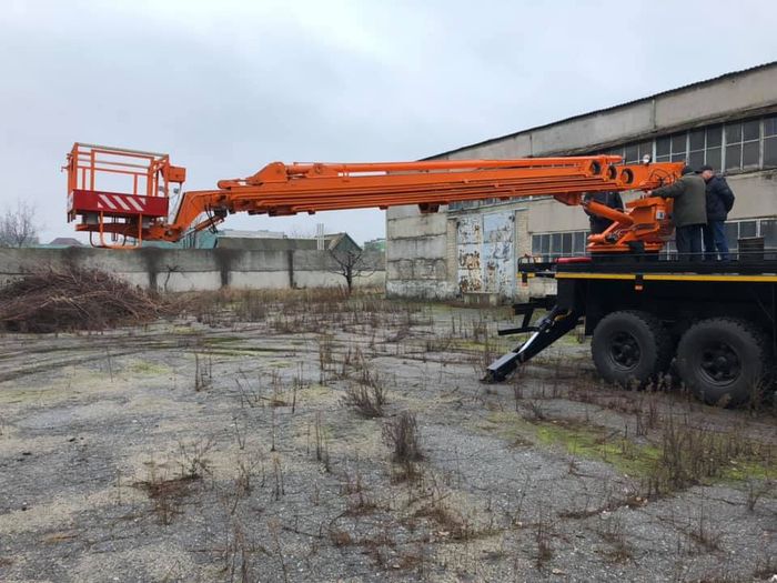 На фотографиях изображено испытание очередного подъёмного оборудования на высоту 28 метров, что позволяет не только обслуживать электросети и проводить строительно-монтажные работы на большой высоте, но и эвакуировать людей с верхних этажей девятиэтажных зданий при пожарах и стихийных бедствиях".