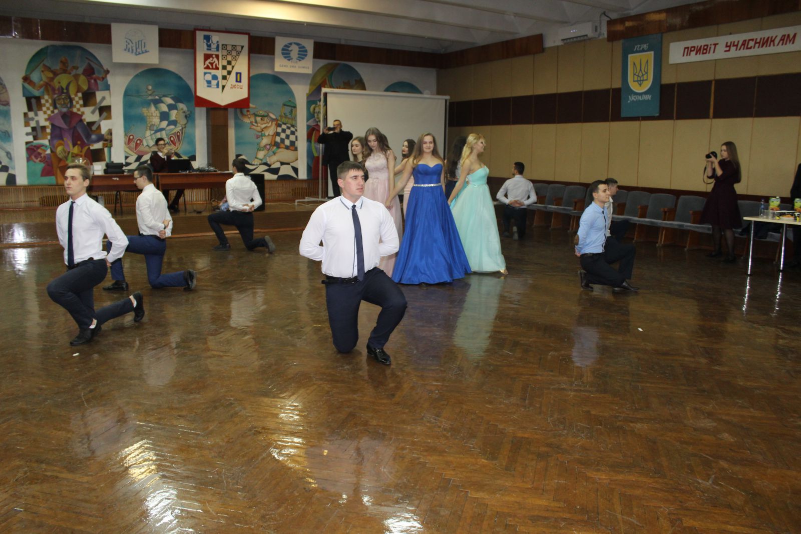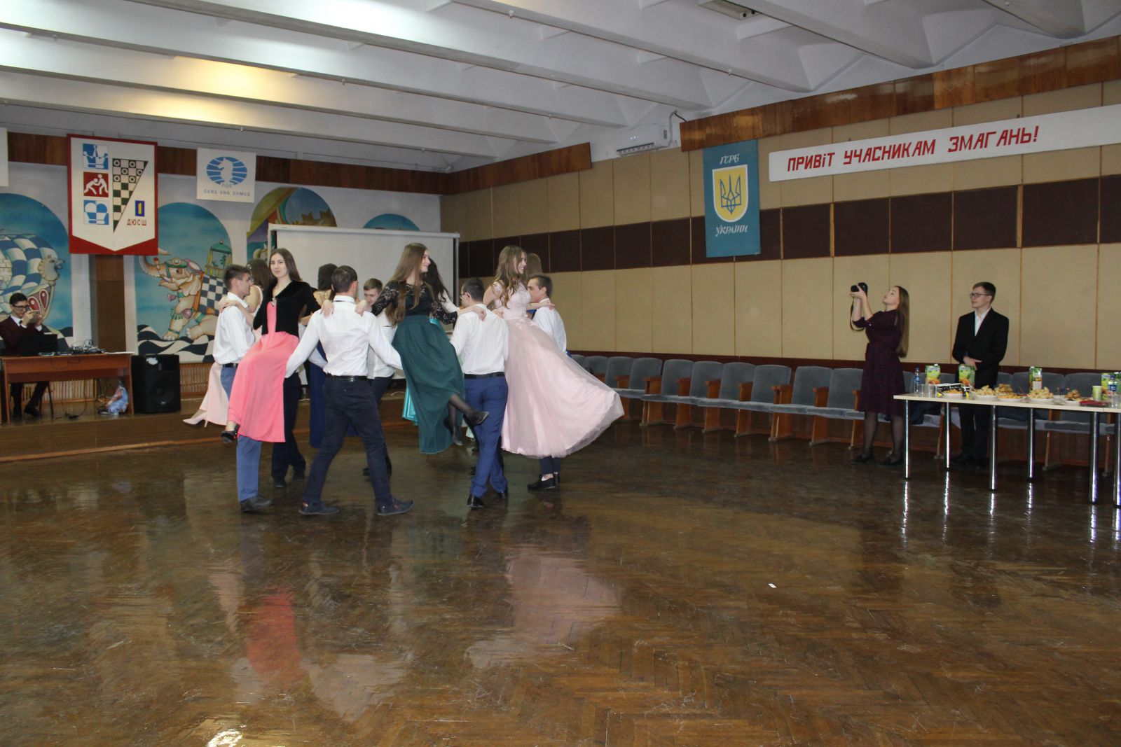 На «Зимний бал» в помещении шахматной школы, где базируется молодежный центр, собралось 44 человека: это и волонтеры центра, и новые ребята. Девушки подобрали соответствующую одежду – вечерние и коктейльные платья, большинство парней пришли в костюмах, белые рубашки украшали галстуки.