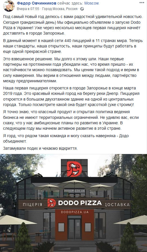 Российский бизнесмен Федор Овчинников в соцсети сообщил о скором открытии пиццерии "Додо" в Запорожье. Это заявление всколыхнуло интернет.