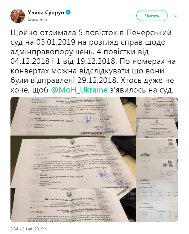 Исполняющая обязанности министра здравоохранения Украины Ульяна Супрун получила пять повесток из Печерского районного суда Киева. Об этом она написала в своем Twitter.