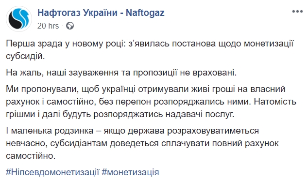 "Нафтогаз" раскритиковал монетизацию субсидий