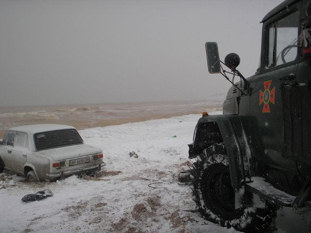 Спасатели Запорожской области накануне Рождества вытащили с пляжа автомобиль, который застрял в песке и снегу прямо на берегу Азовского моря.