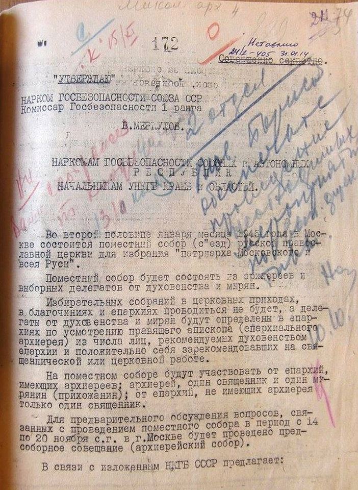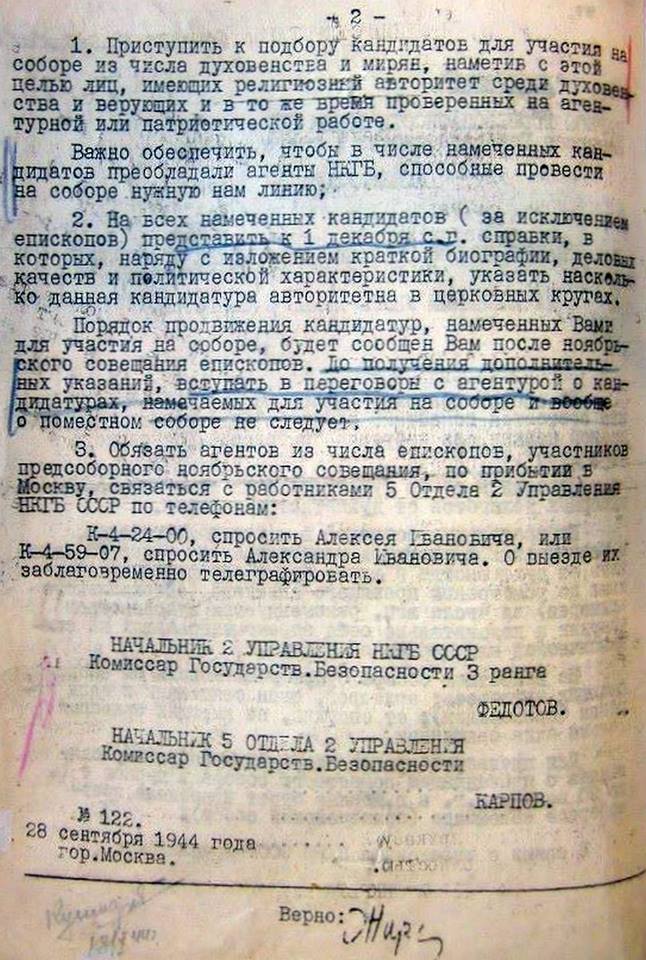 В начале 1945 года в Москве состоялся Поместный собор который положил начало современной Русской православной церкви. Своеобразным "томосом" от Кремля на проведение мероприятия стала Директива № 122 НКГБ СССР, подписанная Комиссарами Госбезопасности Петром Федотовым и Георгием Карповым. За успешное проведение Поместного собора генерал-майор Карпов впоследствии был награждён орденом Трудового Красного Знамени.