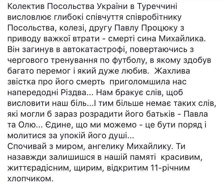 Сын сотрудника посольства Украины в Турции Павла Процюка разбился в жутком ДТП недалеко от поселка Доброе в Тернопольской области. Авария произошла еще 4 января. Об этом сообщили на странице посольства в Facebook.
