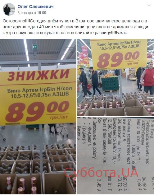 Покупатель приобрел бутылку игристого вина по акции. Расплатившись на кассе за товар, в чеке мужчина увидел совсем другие цифры. Так, вместо 89 гривен покупателю пришлось заплатить 100 гривен.