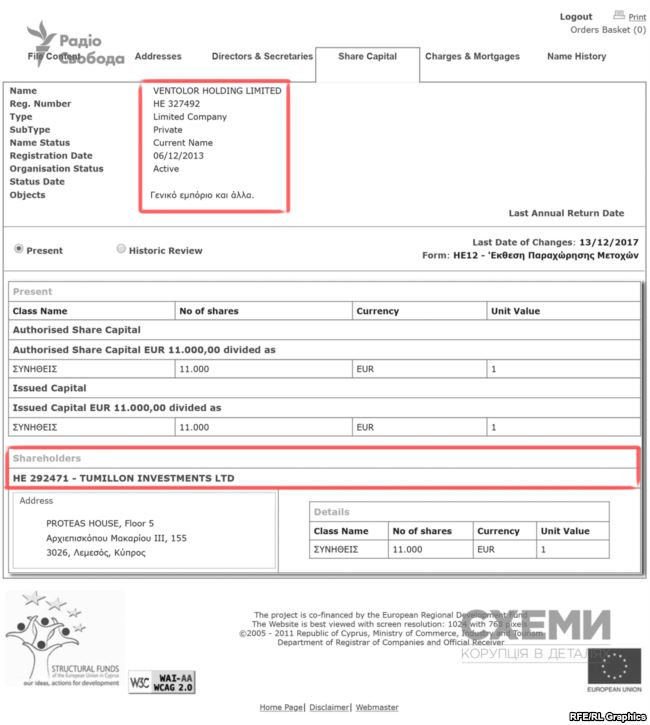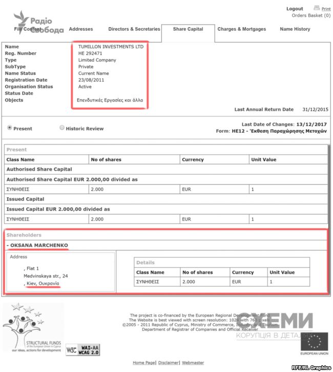 О том, что Гавриковское нефтяное месторождение разрабатывается компанией, связанной с Оксаной Марченко, удалось выяснить после изучения российского Единого государственного реестра юридических лиц. Оказывается, еще в марте 2015 года в Ялте три украинские компании, конечным бенефициаром которых является кума Владимира Путина и Светланы Медведевой, стали совладельцами фирмы ООО "ТАВРИЯ-ИНВЕСТ". Эта компания была основана, помимо прочего, и для того, чтобы контролировать активы, которыми супруги Медведчук владели в Крыму до аннексии полуострова Россией. Из документов ясно, что директором компании является Инна Палий, которая также занимает пост директора в еще одной компании с похожим названием, – ООО "ИК "ТАВРИЯ СЕВЕР". Владельцы последней фирмы – зарегистрированные на Кипре VENTOLOR INVESTMENTS LTD и VENTOLOR HOLDING LTD. VENTOLOR HOLDING LTD была основана еще одной кипрской компанией – TUMILLON INVESTMENTS LTD, собственником которой является Оксана Марченко.