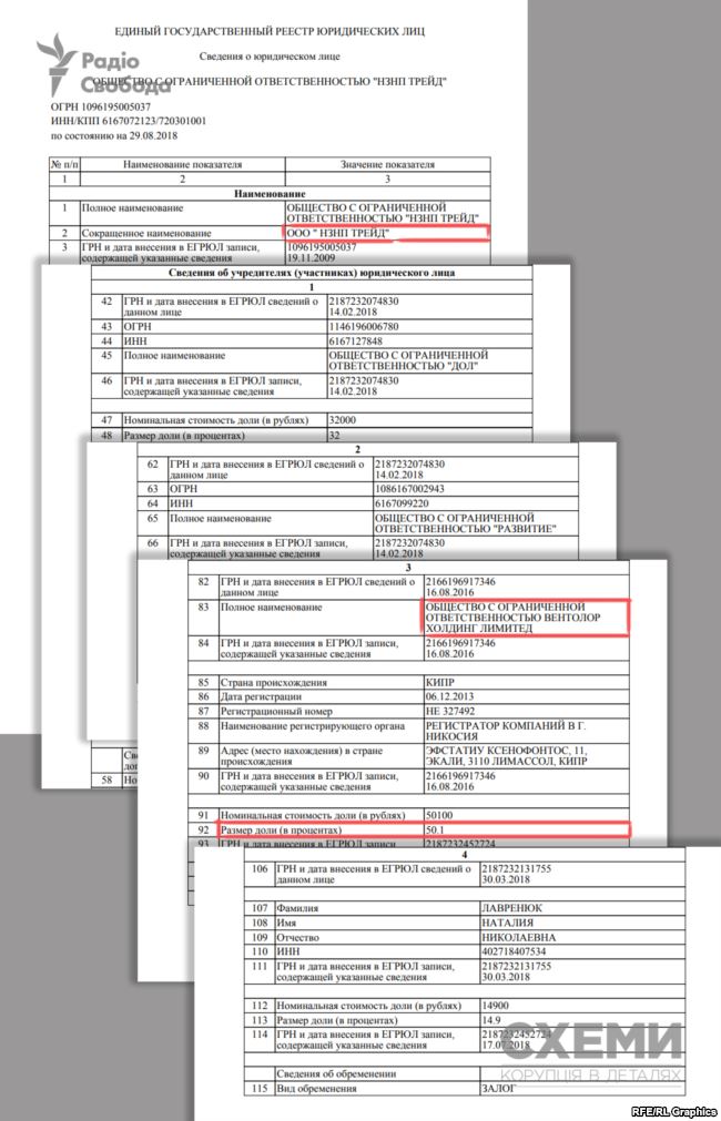 Выигравшая конкурс на добычу нефти в Ханты-Мансийском автономном округе ООО "НЗНП Трейд" только на 32 процента принадлежит бизнесмену-аграрию Сергею Кислову (эту долю контролирует ООО "Дол" его отца, Василия Кислова). Доли в 14,9 процента и 3 процента – собственность компании Наталии Лавринюк и фирмы "Развитие", а большая часть предприятия – 50,1 процента принадлежит уже упомянутой кипрской фирме Ventolor Holding LTD, основанной TUMILLON INVESTMENTS LTD, собственником которой является Оксана Марченко. Помимо этого, кипрские компании украинской телеведущей владеют и частью в "Торговом доме НЗНП", специализирующемся на продаже нефтепродуктов.