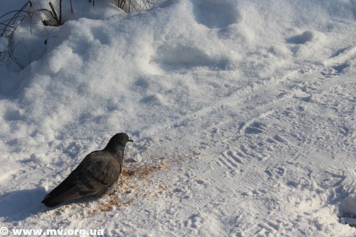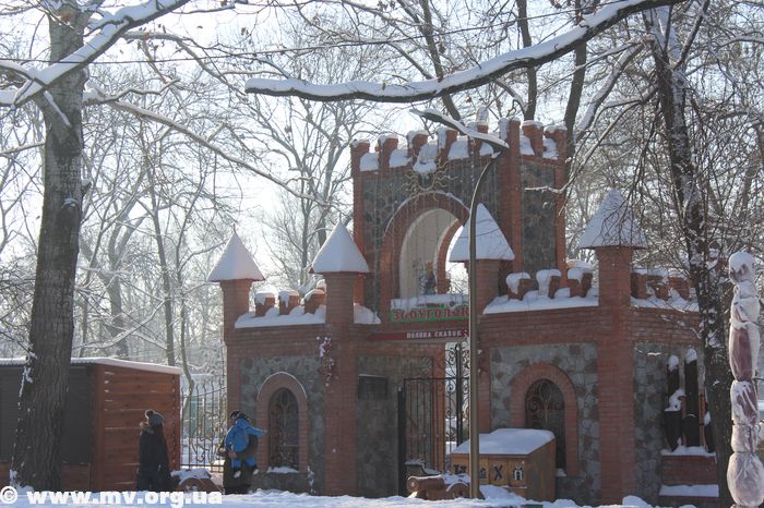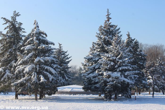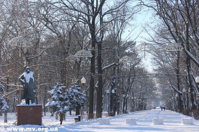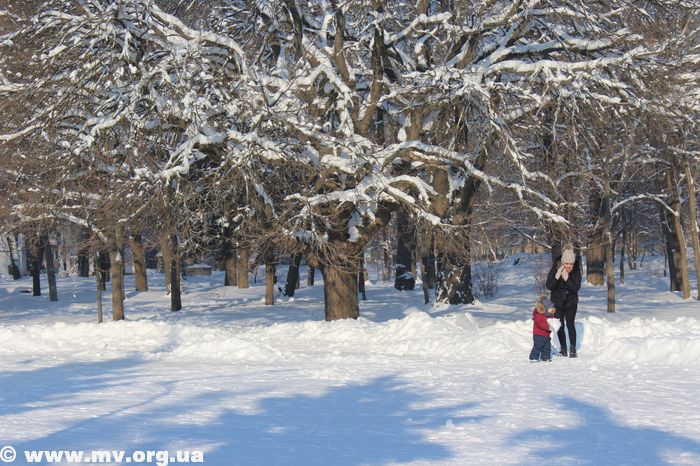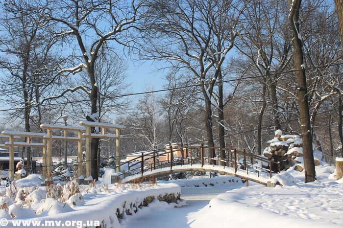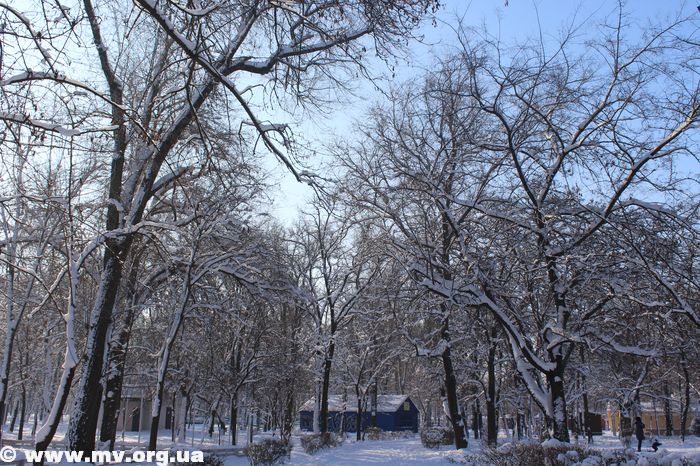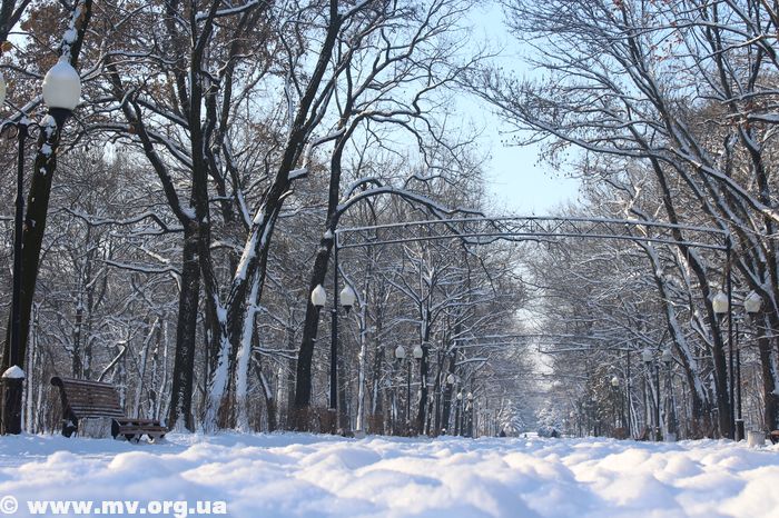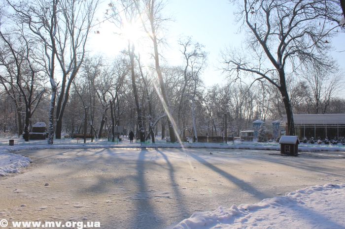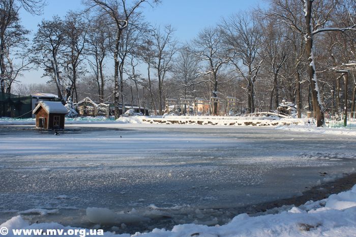 Мелитопольский городской парк в зимнее время года очень красив – вокруг белым-бело, над головой летают стаи голубей, тихо, спокойно. Пруд замерз, лебедей не видно, и только утиные следы виднеются на припорошенном снегом льду.
