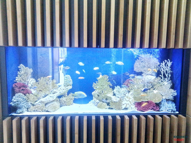 При входе в туалет разместили аквариум с рыбками. В помещении туалета из динамиков доносится пение птиц, стены и пол выложены керамогранитом.