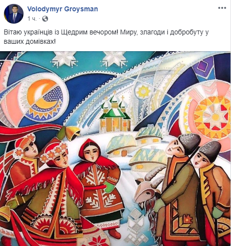 "Поздравляю украинцев со Щедрым вечером! Мира, согласия и благополучия в ваших домах! " - поздравил в Facebook украинцев Гройсман.