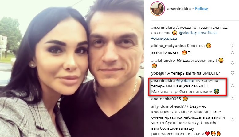 На прямой вопрос, что могло бы означать фото с женатым Топаловым, Арсенина отшутилась. «Ну, конечно, теперь мы шведская семья!!! Малыша втроем воспитываем», — смеется она.