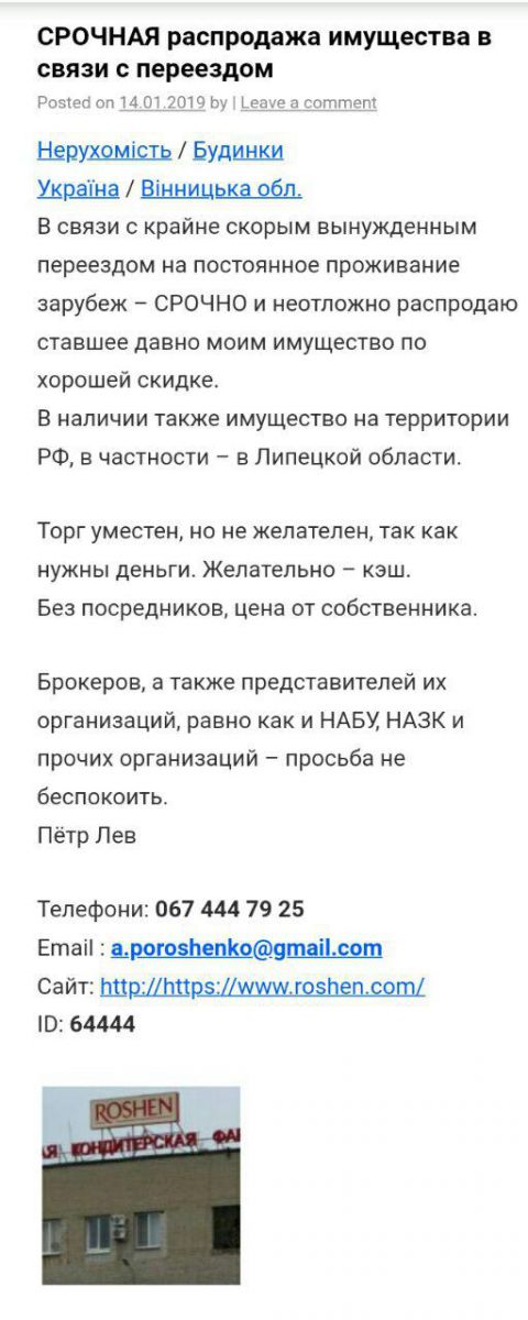 "Срочная распродажа имущества в связи с переездом", - говорится в объявлении. Отметим, что в числе контактной информации указан действующий сайт корпорации Roshen, а также электронная почта а[email protected].