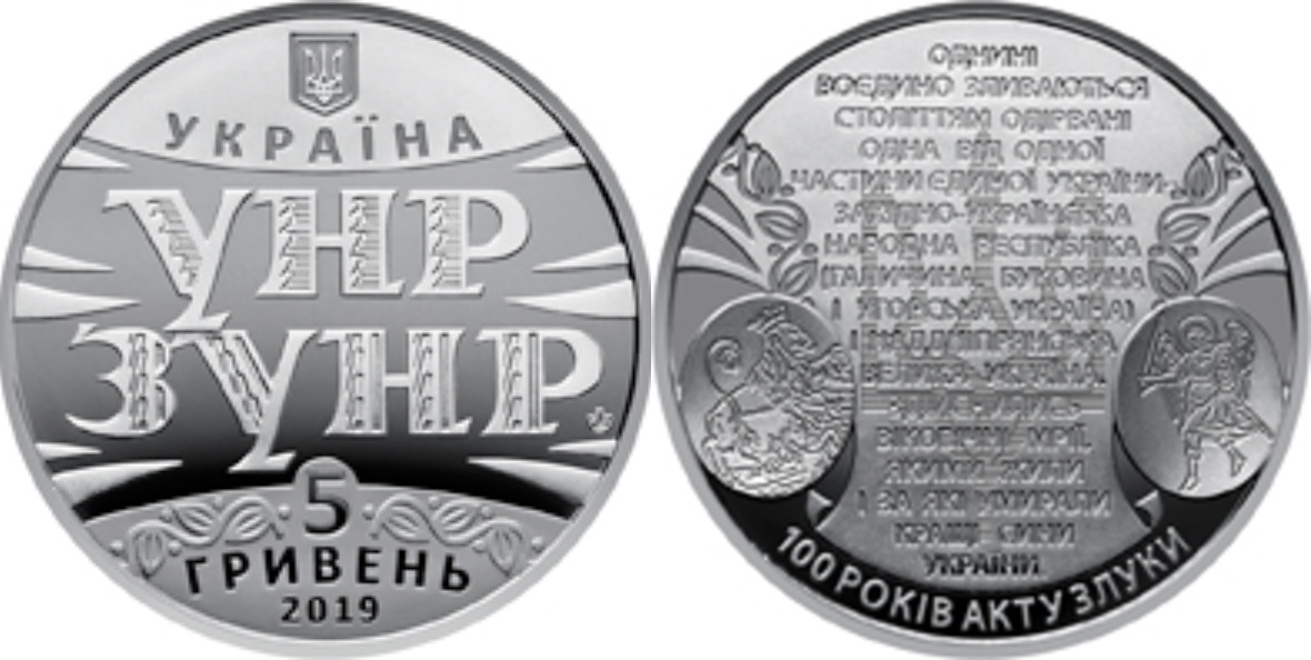 Монета посвящена торжественному провозглашению акта об объединении Украинской Народной Республики и Западно-Украинской Народной Республики 22 января 1919 года.