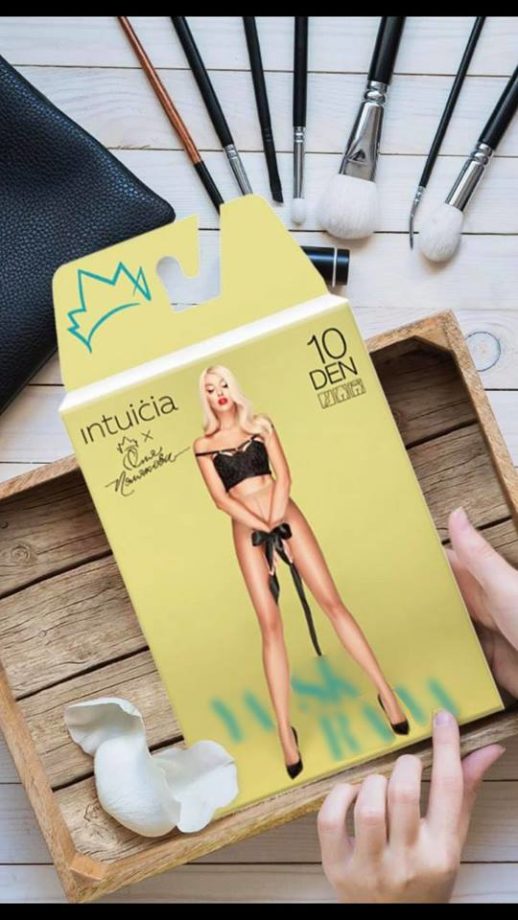Фото Оли Поляковой использовали в рекламной кампании продукции бренда и использовали для дизайна упаковки. Певица позировала в кружевном бра, телесных колготках и классических лодочках. Интимную часть тела звезда прикрыла бантиком. Получилось, как всегда, стильно и сексуально.