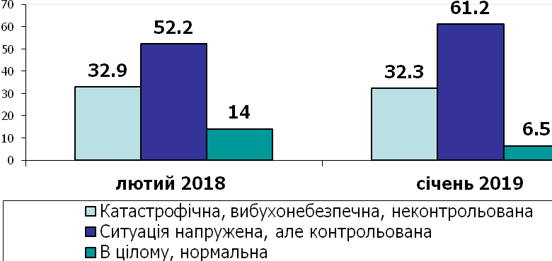 За даними дослідження більшість українців на сьогодні оцінює соціально-політичну ситуацію в країні виразно і небезпечно негативно. Рівень соціальної напруги в настроях виборців України залишається високим, а гострота сприйняття ситуації як складної і напруженої, хоча і контрольованої, суттєво посилилася. Якщо у лютому 2018 року 52% вважали ситуацію в країні напруженою і складною, то на сьогодні таких маємо 61%. Ще майже 1/3 розцінюють ситуацію як катастрофічну і вибухонебезпечну.