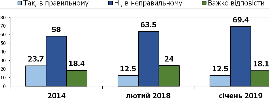 Переважна більшість українців вважають курс яким веде країну чинна влада неправильним – так зазначили 68% опитаних. Причому, така точка зору за останні роки лише посилюється: у 2014 році 58% опитаних вважали курс розвитку України неправильним, у лютому 2018 – 63% і на сьогодні таких 69%.