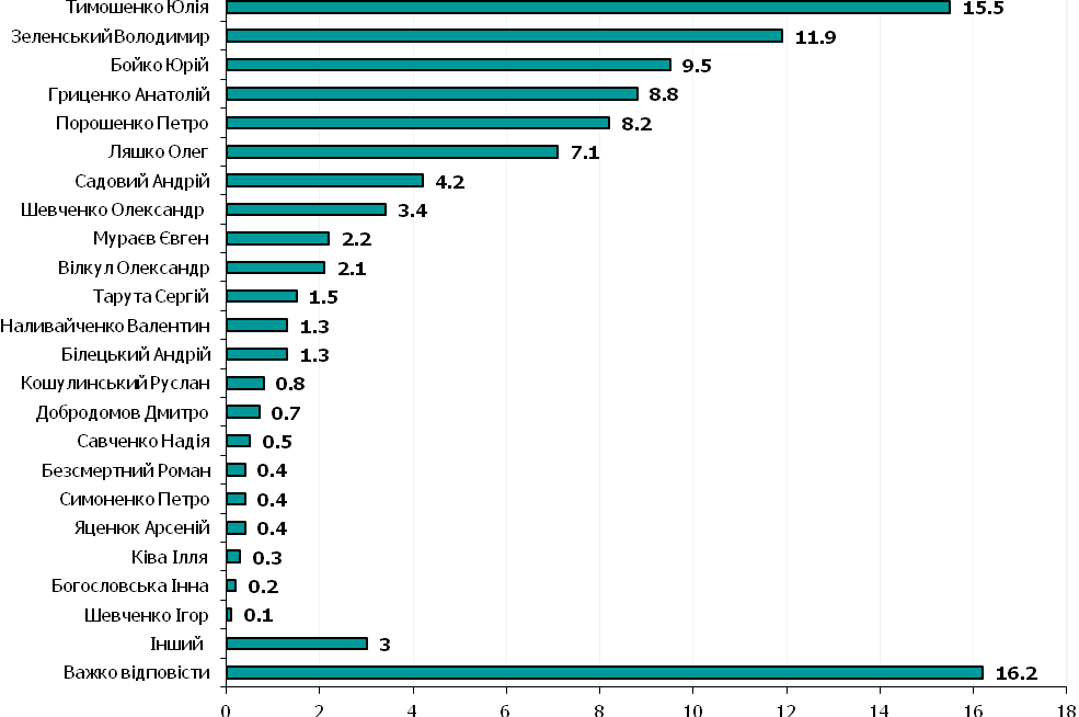 У рейтингу кандидатів у президенти, за даними дослідження, лідирує Ю.Тимошенко – за неї готові голосувати 15,5% тих, хто піде на вибори. Друге місце посідає В.Зеленський – 11,9%. Далі із незначним розривом ідуть Ю.Бойко – 9,5%,, А.Гриценко – 8,8% та П.Порошенко – 8,2% і О.Ляшко – 7,1%.