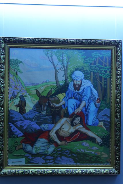 - Сюжеты для своих работ я беру из Библии, - рассказывает Нина Николаевна. - Увеличиваю картинку в 25 раз. Затем рисую на простыне, а потом под копирку наношу контуры на ткань и, как дети раскрашивают цветные картинки, так и я сажусь и творю с помощью ниток, исходя из своего вкуса и воображения.