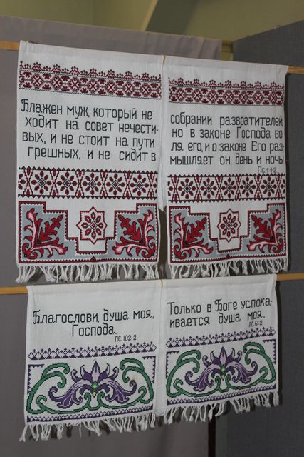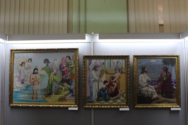 Картины Нина Николаевна вышивает большие. Их размер стартует от метра в длину и ширину, и достигает полутора. Свои работы она «одевает» в массивные рамы, отчего весят они от восьми килограммов и больше. За сравнительно недолгое время рукодельница успела создать 17 картин, из которых на выставке не было только одной, семь рушников со словами из Библии и 36 вышиванок, 16 из которых она раздарила.