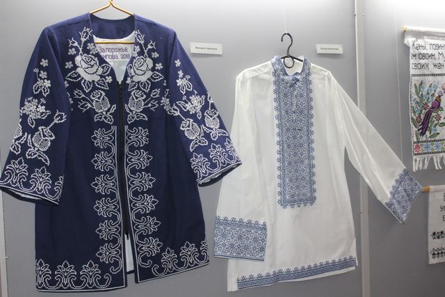 И хоть картины библейских сюжетов (икон среди них нет) - основное направление работ мастерицы, она создает и рушники, и вещи для детей. Имеется у нее уникальная коллекция вышиванок «Княжі убори», состоящая из двадцати мужских и женских сорочек. Во время сегодняшнего открытия сорочки в сорочки из этой коллекции обрядились участницы запорожского народного фольклорного коллектива "Журавушка", которые исполнили для гостей выставки несколько композиций.