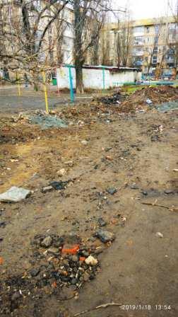 Но красиво стало не везде. Весь снятый асфальт, подложку и другие насыпные материалы ссыпали в центре двора, превратив красивый двор и детскую площадку в отходную яму для строительного мусора и прочих отходов.