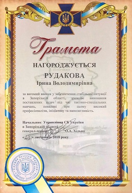 За проявленный при проведении антитеррористических мероприятий высокий профессионализм, весомый личный вклад в обеспечение стабильной ситуации в области и образцовое выполнение заданий во время проведения тактико-специальных учений отмечены 20 человек: в частности, первый заместитель Мелитопольского городского головы Ирина Рудакова, инспектор управления по вопросам чрезвычайных ситуаций исполнительного комитета Мелитопольского городского совета Петр Седик и начальник отдела по мобилизационной и оборонной работе исполнительного комитета Мелитопольского городского совета Екатерина Ломницкая.