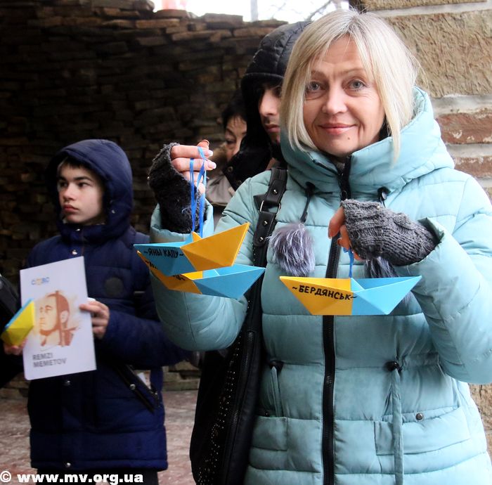 Даже дождь не помешал активистам собраться и поддержать своих соотечественников. Каждый держал в руках фотографию одного из политзаключенных и кораблик. Многие стояли с листовками со слоганами: "Крымские татары не террористы", "Освободить крымских моряков", "Свободу политзаключенным Кремля", а также украинскими и крымско-татарскими флагами. Среди тех, кто пришел поддержать акцию, были люди не только старшего возраста, но и молодежь, подростки, дети. Проникнуться атмосферой единения ради одной цели собралось порядка 50 человек.