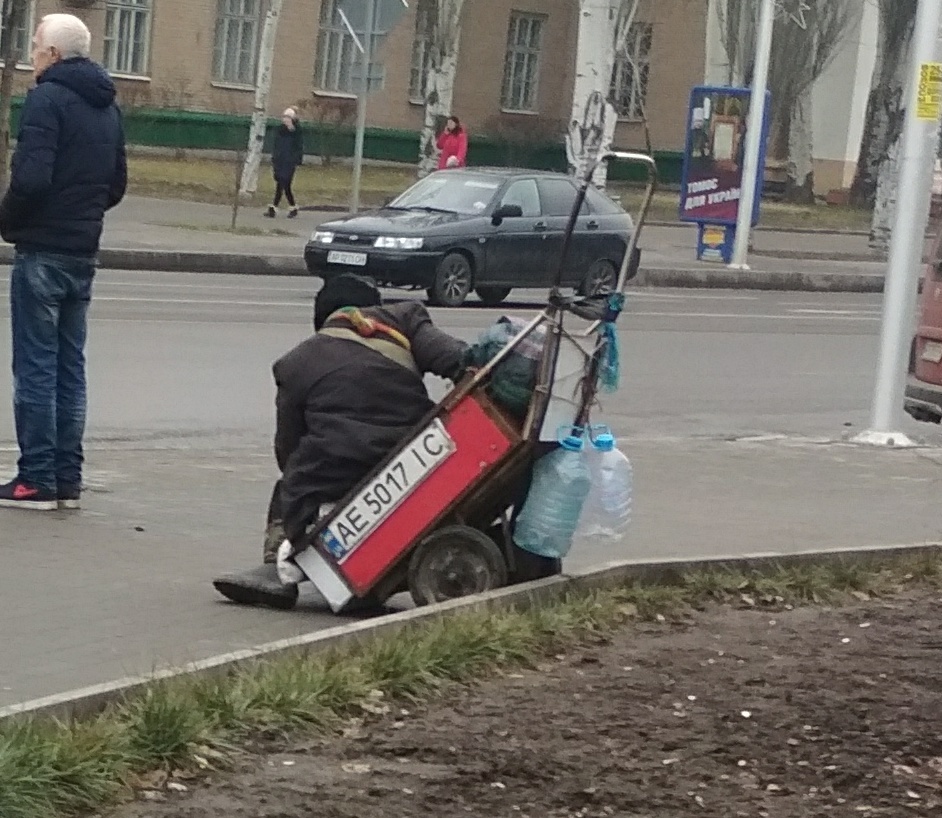"Постійно помічаю цього чоловіка у людних місцях с табличкою "живу без дома". Зацікавився державним номером на авто, який прикріплений на його візку. Цікаво, хтось, напевно загубив номер, а чолов'яга вирішив його так використати", - пишет в соцсети горожанин, пожелавший остаться неизвестным.