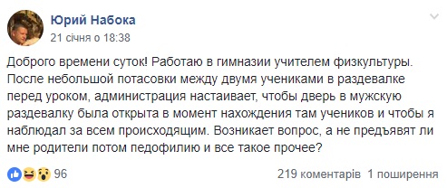 Учитель физкультуры, который работает в одной из гимназий города Запорожья, обратился в группу "Батьки SOS" в Facebook с просьбой о помощи.