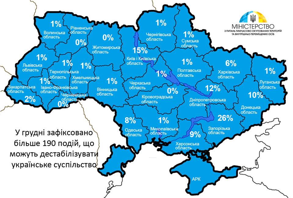 По данным мониторинга Министерства по вопросам временно оккупированных территорий (МВОТ) и ВПЛ Украины, в декабре 2018 года наибольшее количество случаев, которые могут дестабилизировать ситуацию в украинском обществе, зафиксировано в Запорожской области (26%), Киеве и Киевской области (15%), Днепропетровской (12%), Донецкой (10%) и Херсонской (9%) областях.