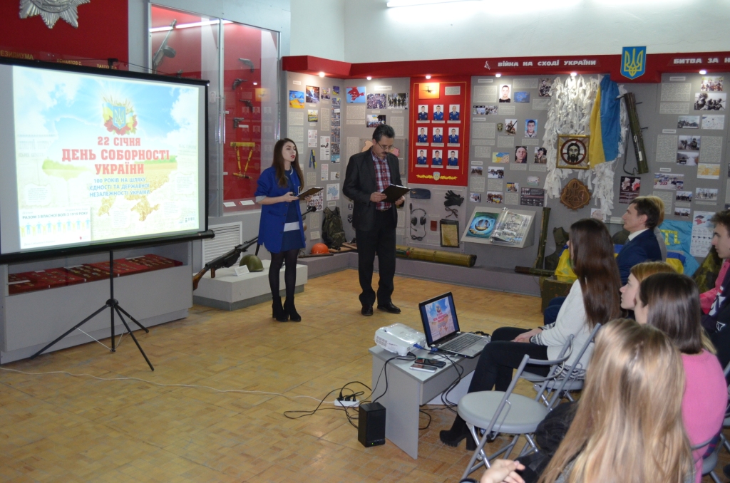 Ученикам 10-11 классов ООШ № 23 научные сотрудники краеведческого музея Александр Чухраенко и Наталья Твердохлеб рассказали об историческом факте объединения украинского народа и его значении, об обстоятельствах принятия IV Универсала. На музейном историко-патриотическом часе ученики пересмотрели документальные видеофильмы по этим темам, а в конце встречи научные сотрудники провели викторину о государственных и национальных символах Украины. За правильные ответы дети получили музейные сувениры.