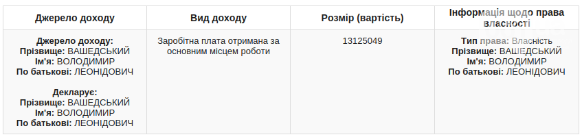 В графе зарплаты за 2017 год указана цифра — 13 125 049 гривен. В декларациях за предыдущие годы Вашедский указывал сумму в 100 тысяч гривен.