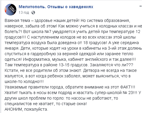 В группе Фейсбука «Мелитополь. Отзывы о заведениях» появился пост о холоде в школе № 7.