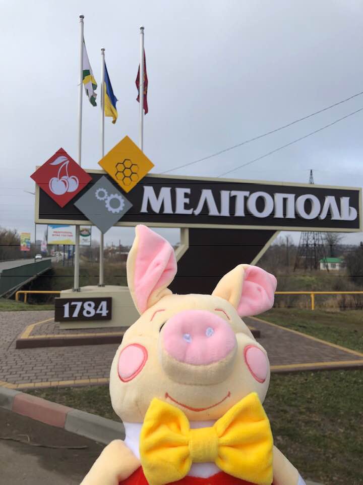 На своей странице в Фейсбуке замминистра выложил фотографию свинки Свина на фоне стелы Мелитополя, которая встречает посетителей на въезде в Мелитополь со стороны Константиновки.