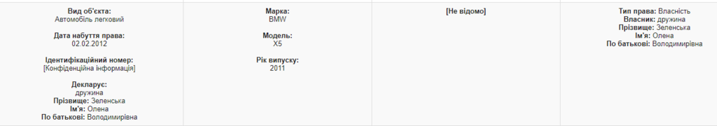 По информации Лига.net, шоумен добавил в перечень движимого имущества автомобиль супруги Елены BMW X5 2011 года выпуска. При этом цена покупки автомобиля, купленного в 2012 году, не уточняется.