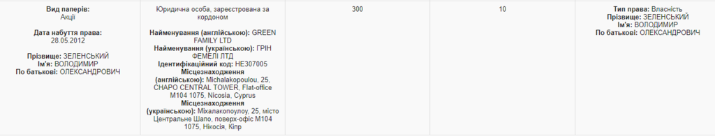Кроме этого, кандидат в президенты от партии "Слуга народа" признался, что владеет 300 акциями компании Green Family LTD (Никосия, Кипр), при том что ранее он заявлял, что вышел из этой компании, которая контролирует компании в России. В декларации указано, что акционером Green Family LTD он является с 28 мая 2012 года.