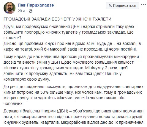 Также Парцхаладзе привел данные исследований, согласно которым для посещения уборных женщинам требуется на 50% больше времени, чем мужчинам.