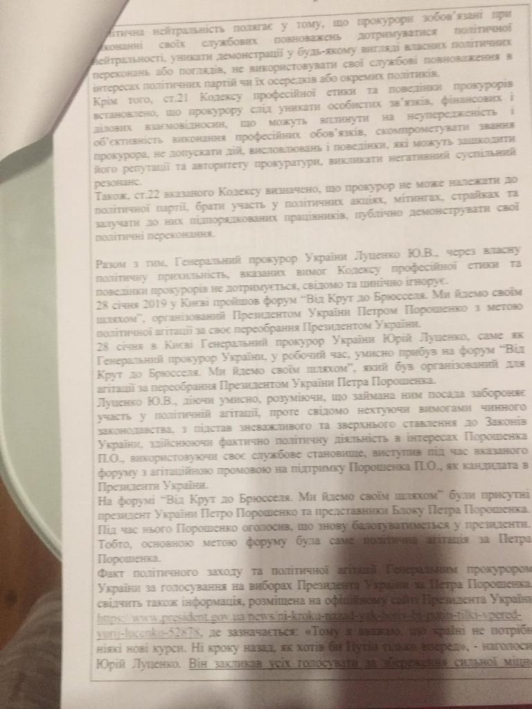 «…Луценко Ю.В., діючи умисно, розуміючи, що займана ним посада забороняє участь у політичній агітації, проте свідомо нехтуючи вимогами чинного законодавства, з підстав зневажливого та зверхнього ставлення до Законів України, здійснюючи фактично політичну діяльність в інтересах Порошенка П.О., використовуючи своє службове становище, виступив під час вказаного форуму з агітаційною промовою на підтримку Порошенка П.О., як кандидата в Президенти України», — зокрема зазначається в дисциплінарній скарзі.
