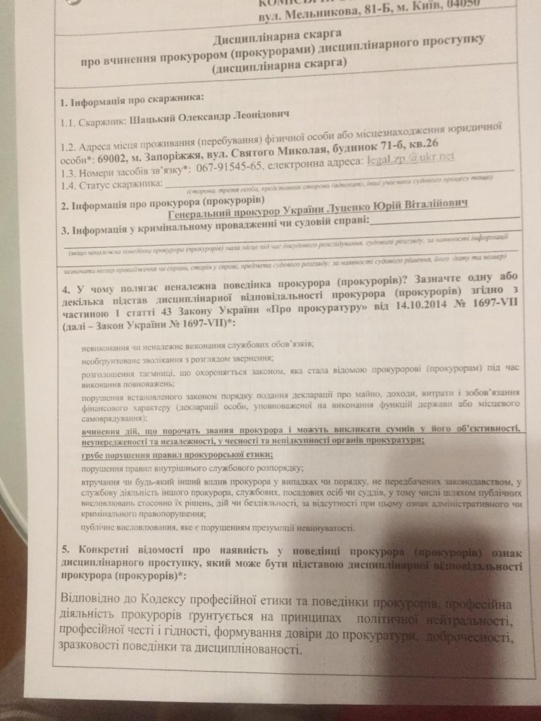 Скаргу на Юрія Луценка подав наш земляк, відомий запоріжець, почесний працівник прокуратури України, державний радник юстиції 3-го класу (що відповідає званню генерал-майор), відомий своєю активною громадською діяльністю щодо організації Євромайдану та протестних акцій проти «режиму Януковича» у 2013-2014 роках, — Шацький Олександр Леонідович.