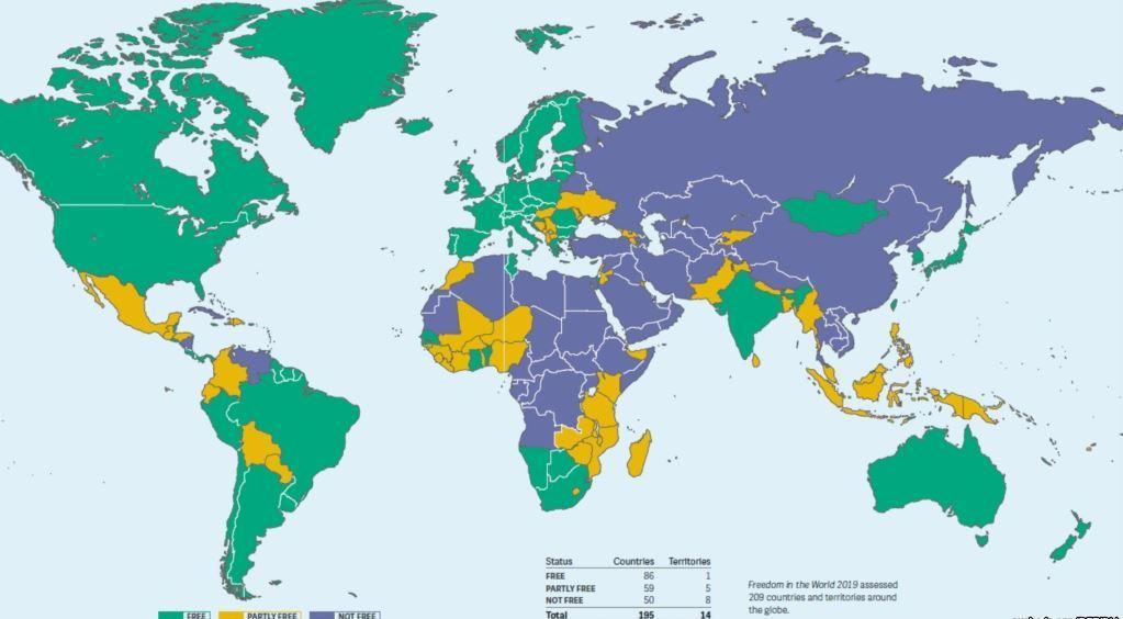 Глобальное снижение уровней политических и гражданских свобод наблюдается уже тринадцатый год подряд – начиная с 2005 года, говорится в новом отчете Freedom House под названием «Freedom in the world 2019» («Свобода в мире в 2019 году»).