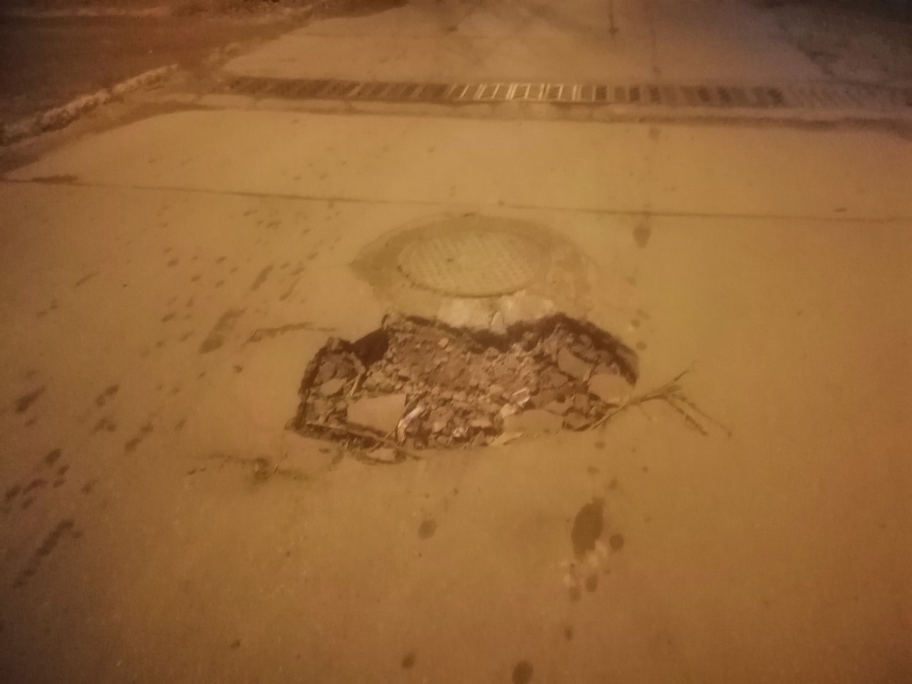 Огромнейшая яма образовалась прямо посреди дороги возле канализационного люка. Асфальт в этом месте просто провалился.