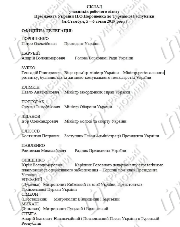 Так, в составе официальной делегации на получение томоса об автокефалии ПЦУ вместе с Порошенко отправились спикер Рады Парубий, заместитель главы АП Константин Елисеев, советник президента Ростислав Павленко, первый помощник президента Юрий Онищенко, предстоятель ПЦУ Епифаний, митрополит Винницкий и Барский Симеон, митрополит Луцкий и Волынский Михаил, а также вице-премьер – министр регионального развития, строительства и ЖКХ Геннадий Зубко, министр иностранных дел Павел Климкин, министр обороны Степан Полторак и министр молодежи и спорта Игорь Жданов.